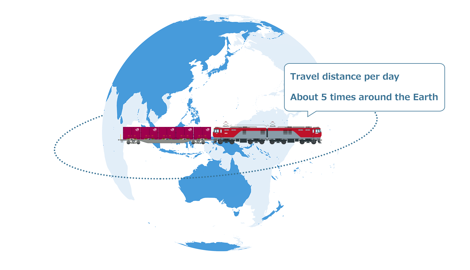 There are approximately 140 container freight stations across Japan. Each day, about 500 trains are operating to transport cargo in every region across Japan with a total of 190,000 kilometers distance travelled. That is equivalent to travelling about 5 times around the Earth!